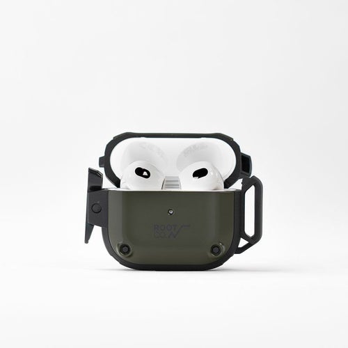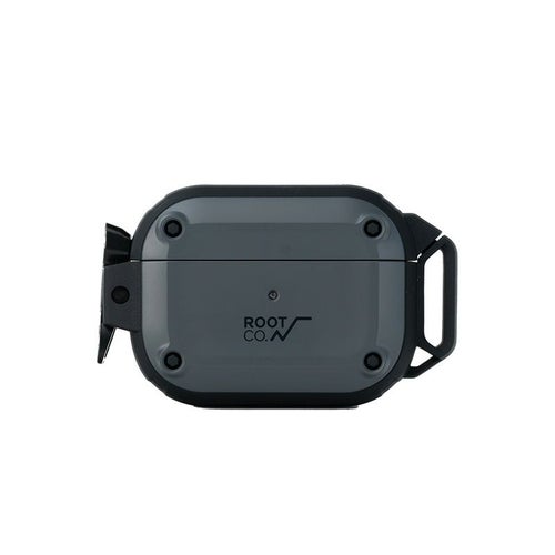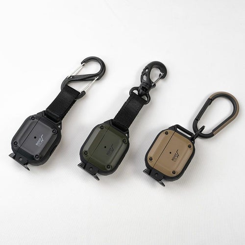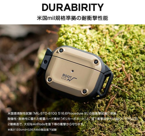 米国MIL規格準拠の耐衝撃性&PCとTPUの2層構造で衝撃吸収力を兼ね備えたAirPodsケース。20mm幅のウェビングテープ等を取り付け可能なループと二重リングを取り付け可能なホールをサイドに搭載し、安心のロック機構を採用しました。
