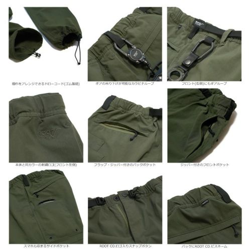 ウエスト両サイドとフロントのカラビナループには、ギアの吊り下げが可能。ROOT CO.のMAG REELシリーズやTRIAD CABINERとの相性も抜群です。