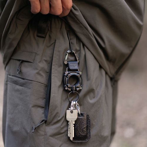 ギアの吊り下げが可能なカラビナループは、フロント右足側のゴム紐ループ・ウエスト両サイドのウェビングループの全3箇所。ROOT CO.のMAG REELシリーズや各種カラビナとの相性も抜群です。