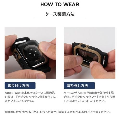 Apple Watch本体を本ケースに嵌め込む際は、「デジタルクラウン側」から先に嵌め込むんでください。(取り外しの際はデジタルクラウンと逆側から押し出すように取り外します。)